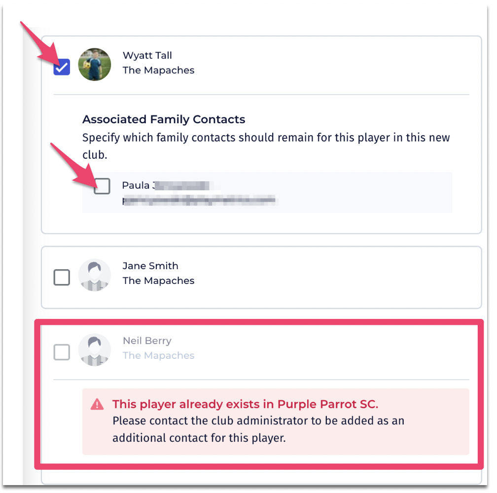 After you select the player(s), you can specify which family contacts should remain for the player in the new club. If the player already exists in the new club, there is a red message indicating this.